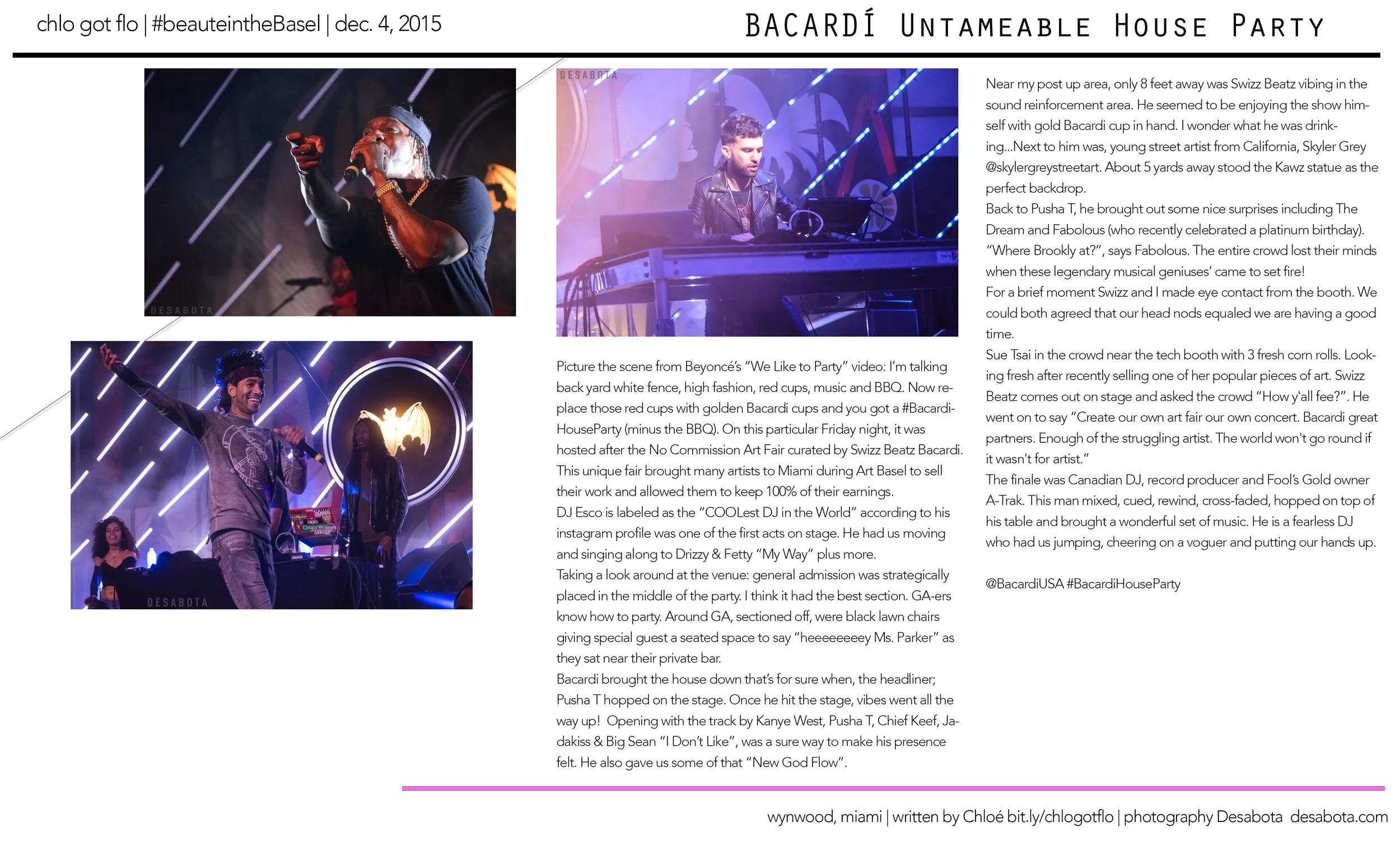 “Picture the scene from Beyoncé’s “We Like to Party” video: I’m talking back yard white fence, high fashion, red cups, music and BBQ. Now replace those red cups with golden BACARDÍ cups and you got a #BACARDÍHouseParty (minus the BBQ). On this particular Friday night, it was hosted after the No Commission Art Fair curated by Swizz Beatz BACARDÍ. This unique fair brought many artists to Miami during Art Basel to sell their work and allowed them to keep 100% of their earnings.